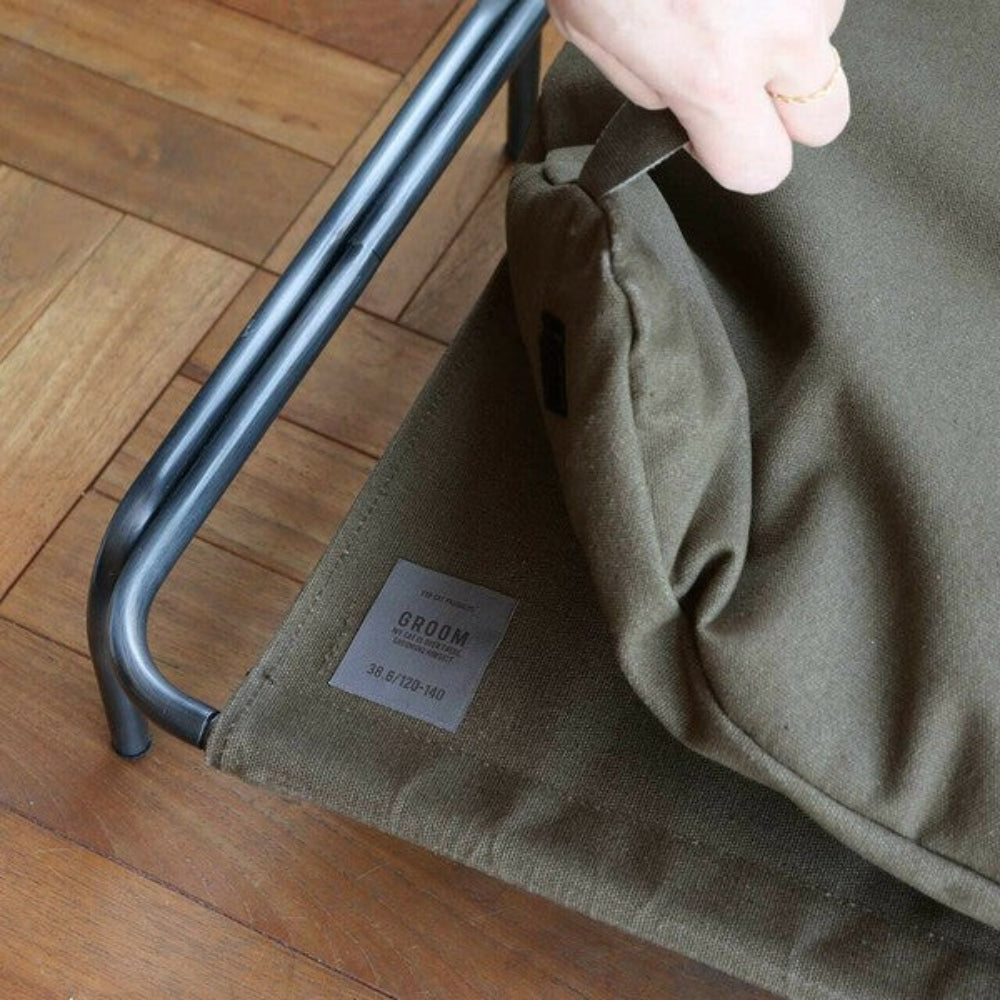 簡約的設計如同小型凳般自然融入室內裝潢,並著重展現工業風和復古質感。保留了焊接痕跡和輕微刮痕的鐵架,配有一組可固定在背面的靠墊。靠墊套可拆卸清洗。